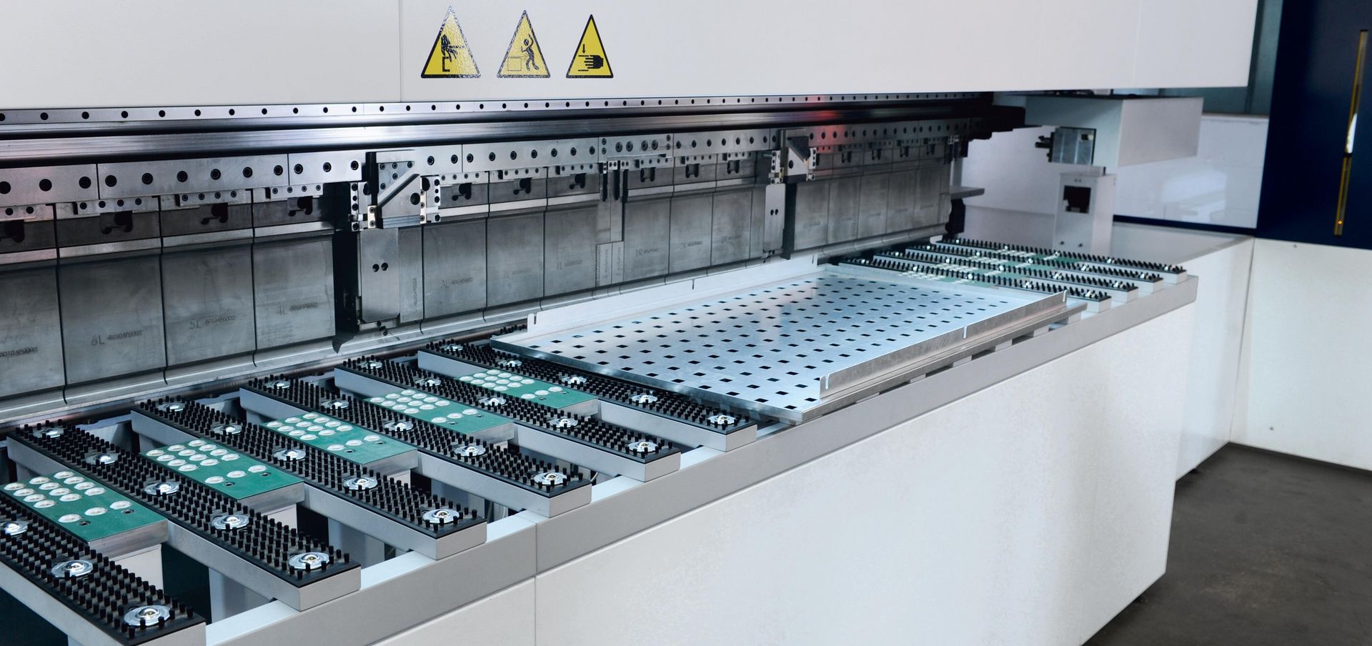 This opens the way to diversity that was previously unachieved. This is because the manipulator can fix the workpieces at differing positions. In this way parts with negative bends and very narrow profiles can be manufactured. Even when using standard tools, the TruBend Center offers a large variety of sizes and shapes: extremely short side lengths, deep boxes, small profiles and, over and above this, parts with formed sections, recesses and widely diverse radii. Also the concept for machining perforated sheets is well thought out. Suction cups or optional magnetic clamps, built for flexible positioning, hold the sheet firmly in place.