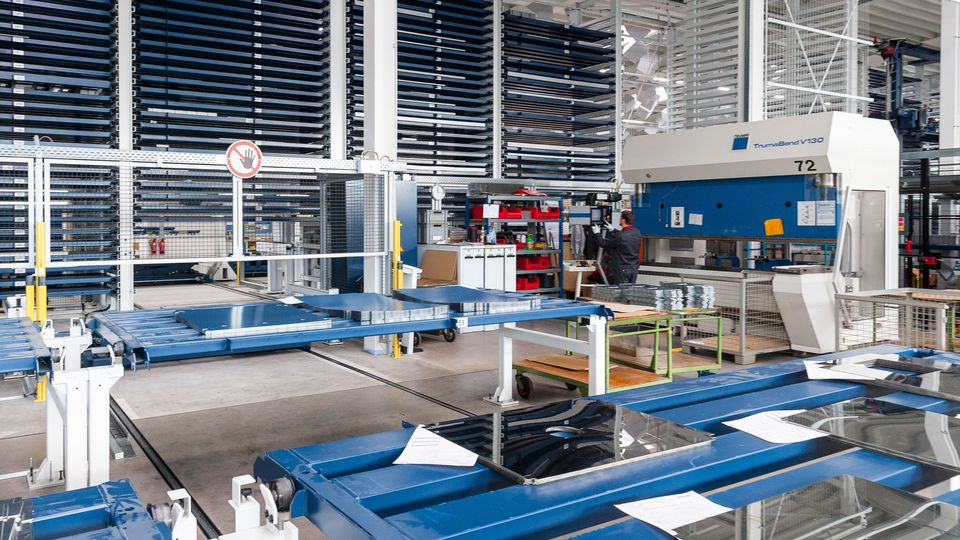 Brightly lit, neat and tidy, the production facility echoes to the staccato sound of the punching machines and the steady humming and whirring of the SheetMaster. An operator strolls up to the machine, glances at the control screen and continues on his way. Behind the machine, a STOPA storage system towers up to the ceiling. Almost seven meters high and some 65 meters long, it provides 582 storage bays for large-format metal sheets and a total storage capacity of 1,750 metric tons. The storage and retrieval machine whizzes back and forth with barely a sound, one minute removing empty pallets and transporting them by rail or trolley to a machine, the next inserting pallets of semi-finished and finished parts into vacant slots. Things are quieter on the other side of the STOPA storage system where two automatic bending machines are hard at work, both of which are also receive their raw materials from the SRM. Productivity on both sides is high, with everything running smoothly and fully automatically. But it wasn’t always like this.