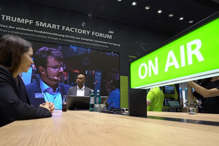 The way that digitalization makes processes easier was also demonstrated in a tour of the TRUMPF in-house sheet metal processing unit. Before the visitors get to see the first machine, they all meet in the green area, the place where the workers meet every morning to coordinate the day’s orders. Various screens show live production information and analyses of the machine utilization of the day before.