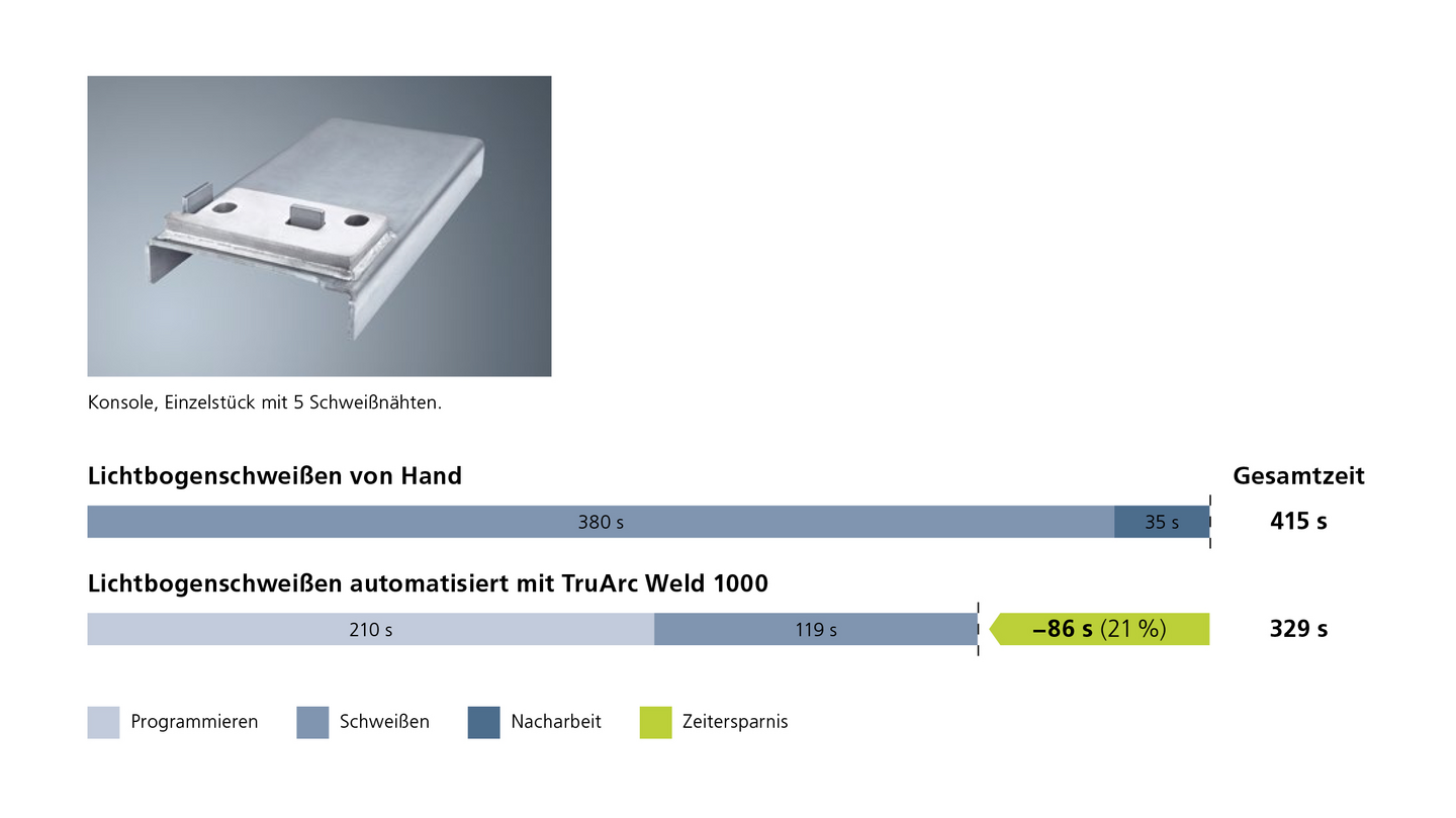 Automated welding pays off from a lot size of 1. You program and weld a simple weld seam in less than a minute with the TruArc Weld 1000. This means that automated arc welding saves time by 21 % even for this single console.