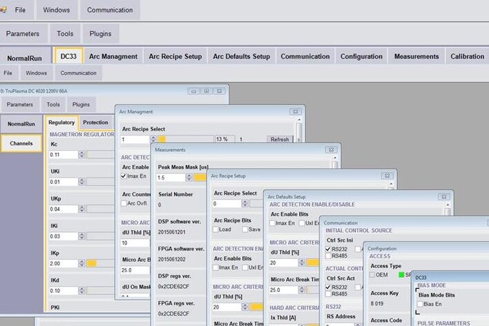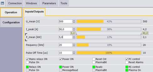 The user-friendly, multilingual PVD Power software offers you numerous operation, configuration and diagnosis options for optimizing process quality and effective error correction: display of actual values for all relevant process parameters as well as warnings and alarms, specification of nominal values by the operator, as well as recording and visualization of important operating parameters with high temporal resolution (oscilloscope function).