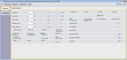 The generators of the TruPlasma Highpulse Series are a single unit in a compact size. They do not require an external DC power supply, are completely water cooled, and thus allow working in a clean room.