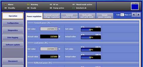 The user-friendly TruControl Power, control software, enables the convenient start-up and secure monitoring of the RF generator or the entire TRUMPF RF system during current processes.