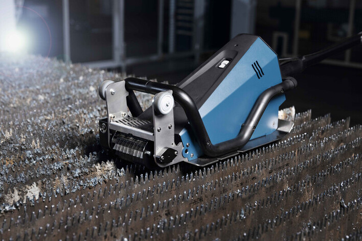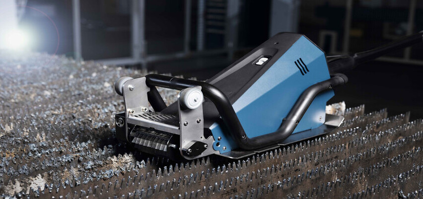 The compact and robust TruTool TSC 200 is designed for fiber lasers with high laser power and correspondingly hard slag up to 25 mm. This is independent of the material. Several factors are decisive for the high cleaning quality and performance. For example, the geometry of the cleaning tool and the feed support. In addition, the balanced weight distribution of the housing and motor ensures smooth and ergonomic operation. The cleaning time for a standard pallet of 1500 mm x 3000 mm with partial loading is approx. 15 minutes. We recommend the optional feed support if you need to clean slag thicknesses > of 15 mm.