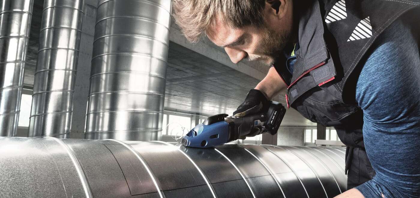 The TruTool C 250 with chip clipper and 18V LiHD rechargeable battery is the first cordless rechargeable slitting shear that cuts sheet thicknesses of 2.5 mm in mild steel and 1.5 mm in stainless steel. The integrated chip clipper enables you to cut off chips at any time with one hand and pull the machine out of the workpiece. Excellent for notching work and interior cut-outs. We provide you with different knives to match the application. The 4.0 Ah / 18V LiHD rechargeable battery also ensures long runtimes.