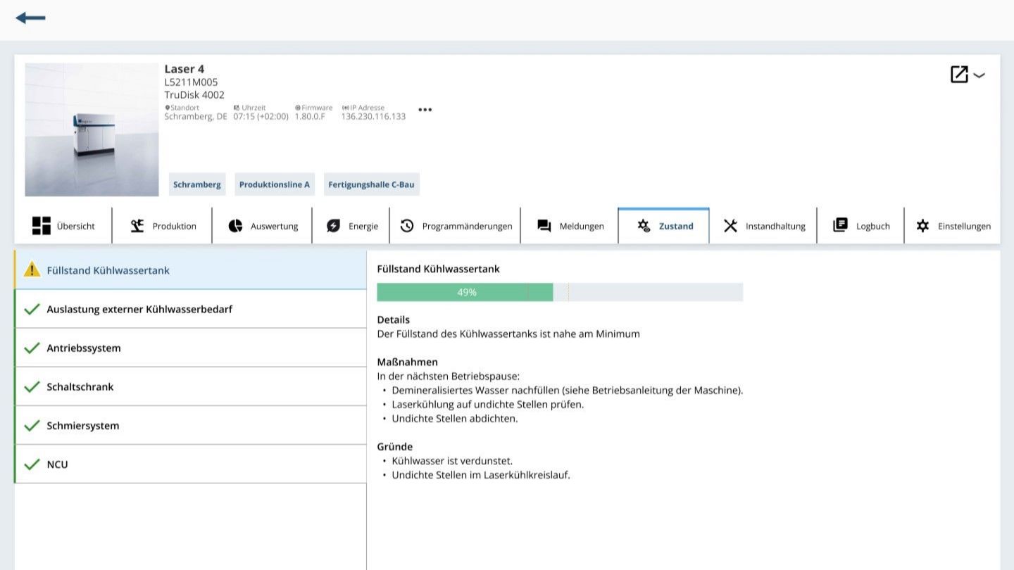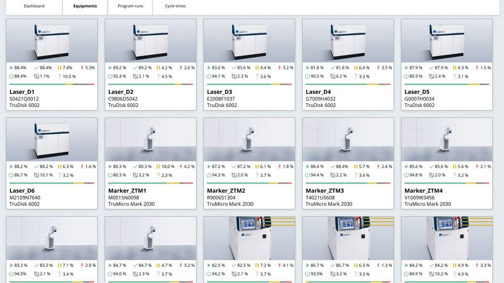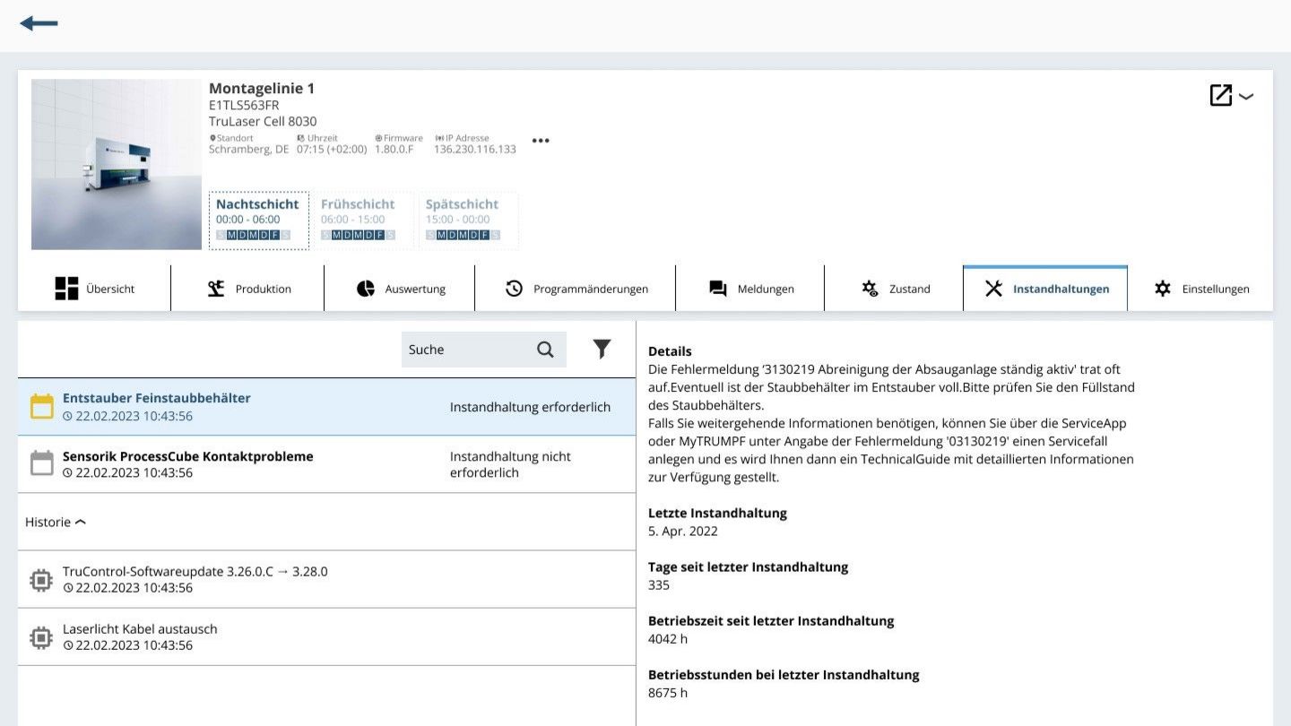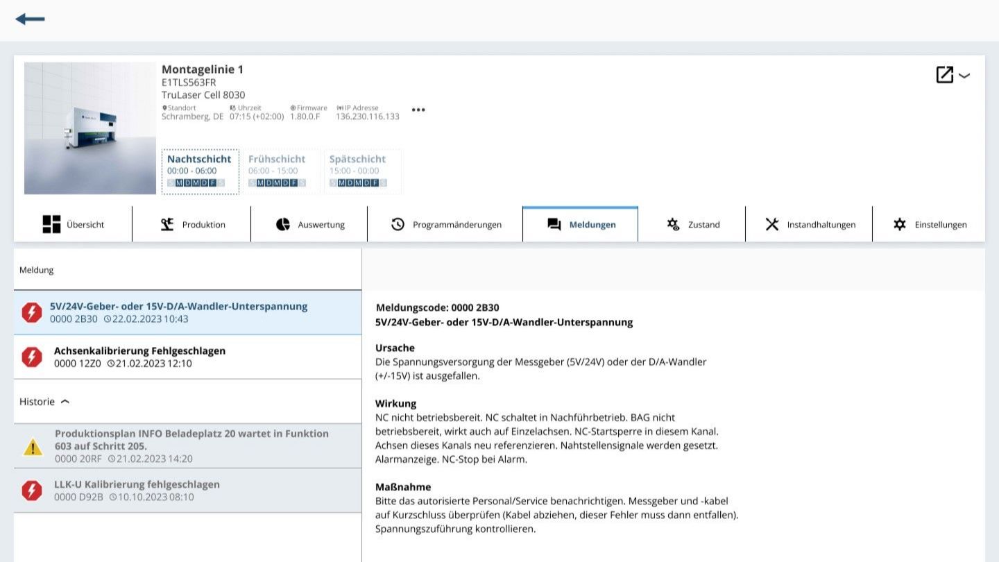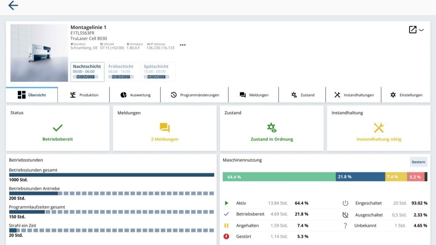 You have the option to access more in-depth detail views. In addition to providing insight into the status conditions, the dashboards also create transparency over extended device data, error messages that have arisen, device utilization, upcoming maintenance data, and changes made to the laser and laser programs.