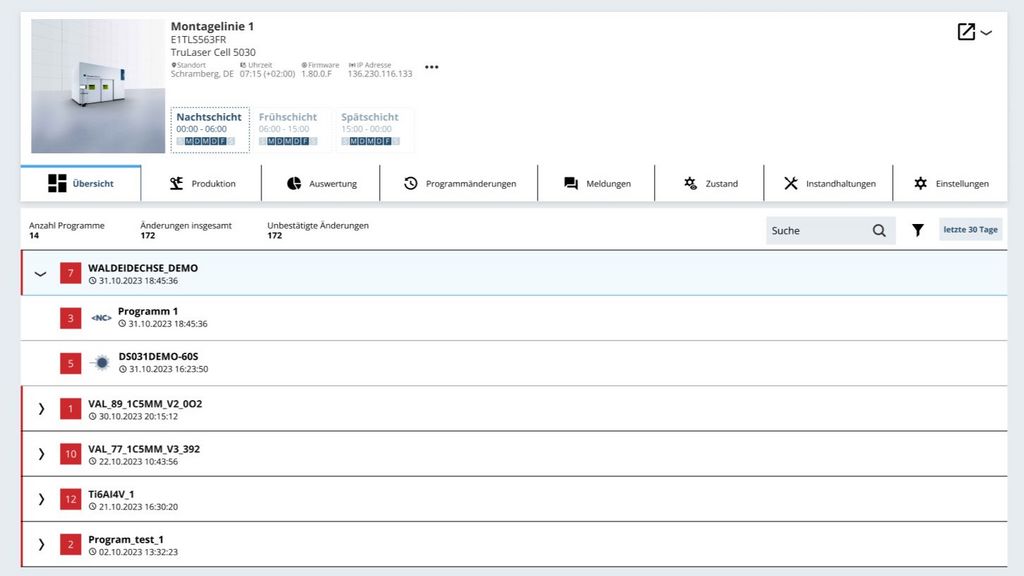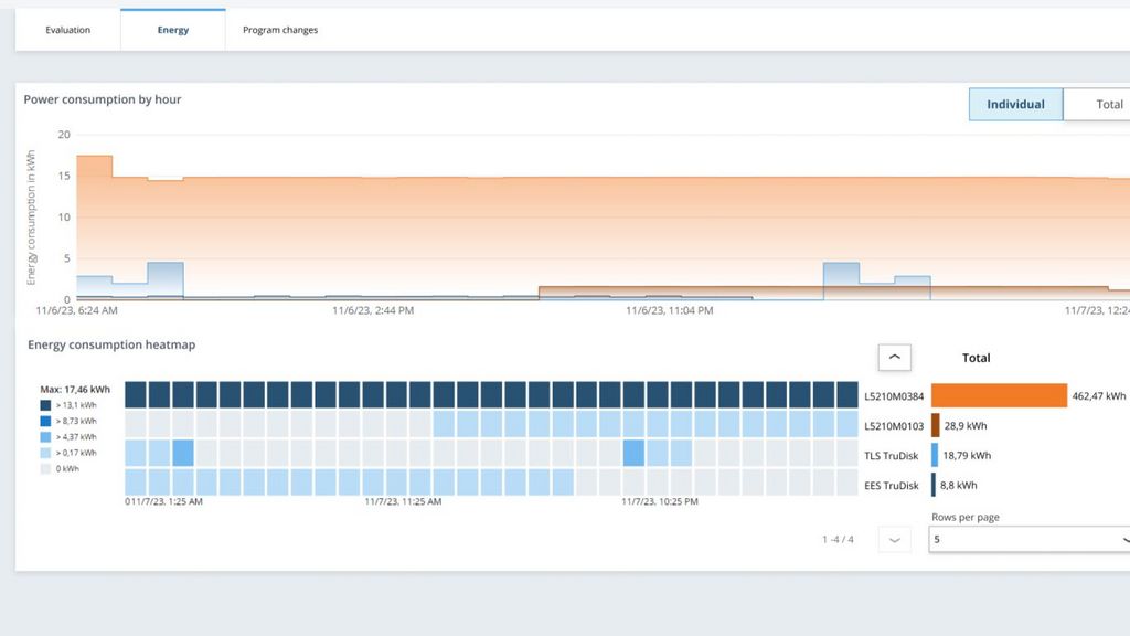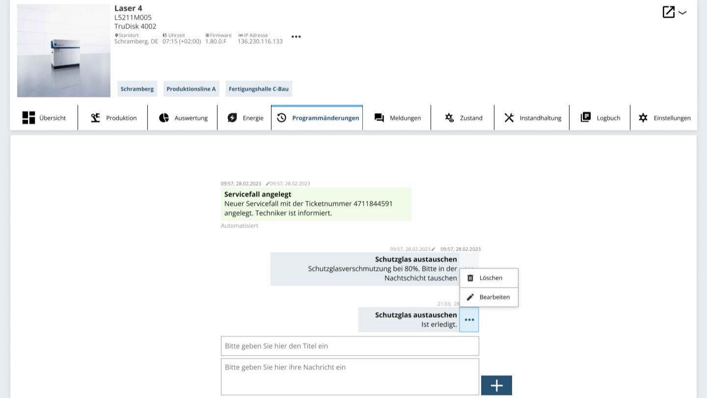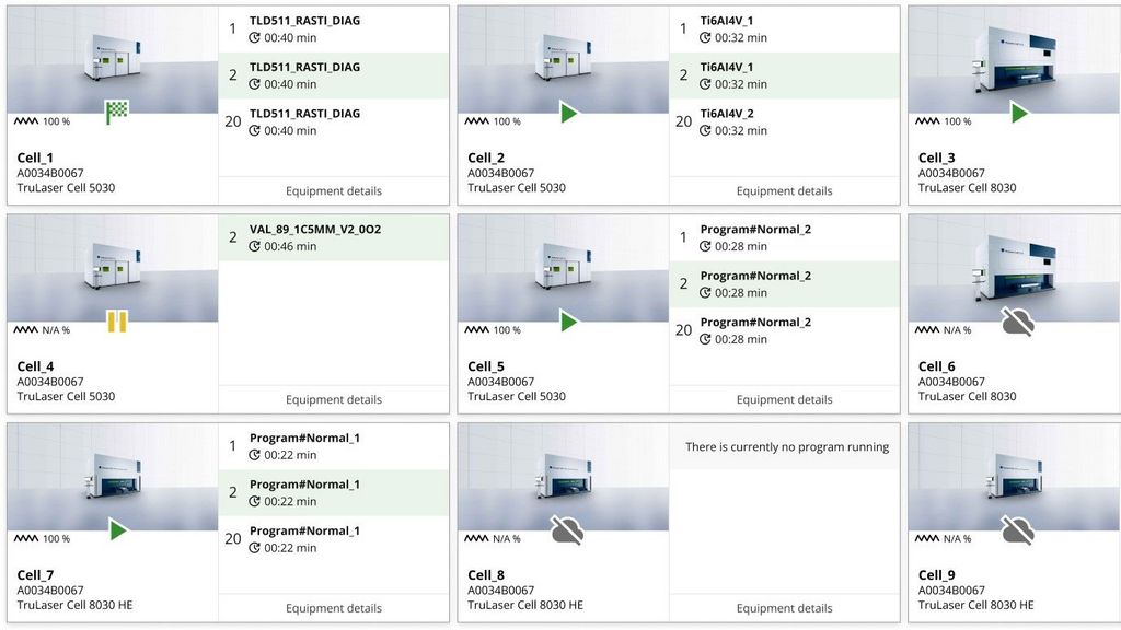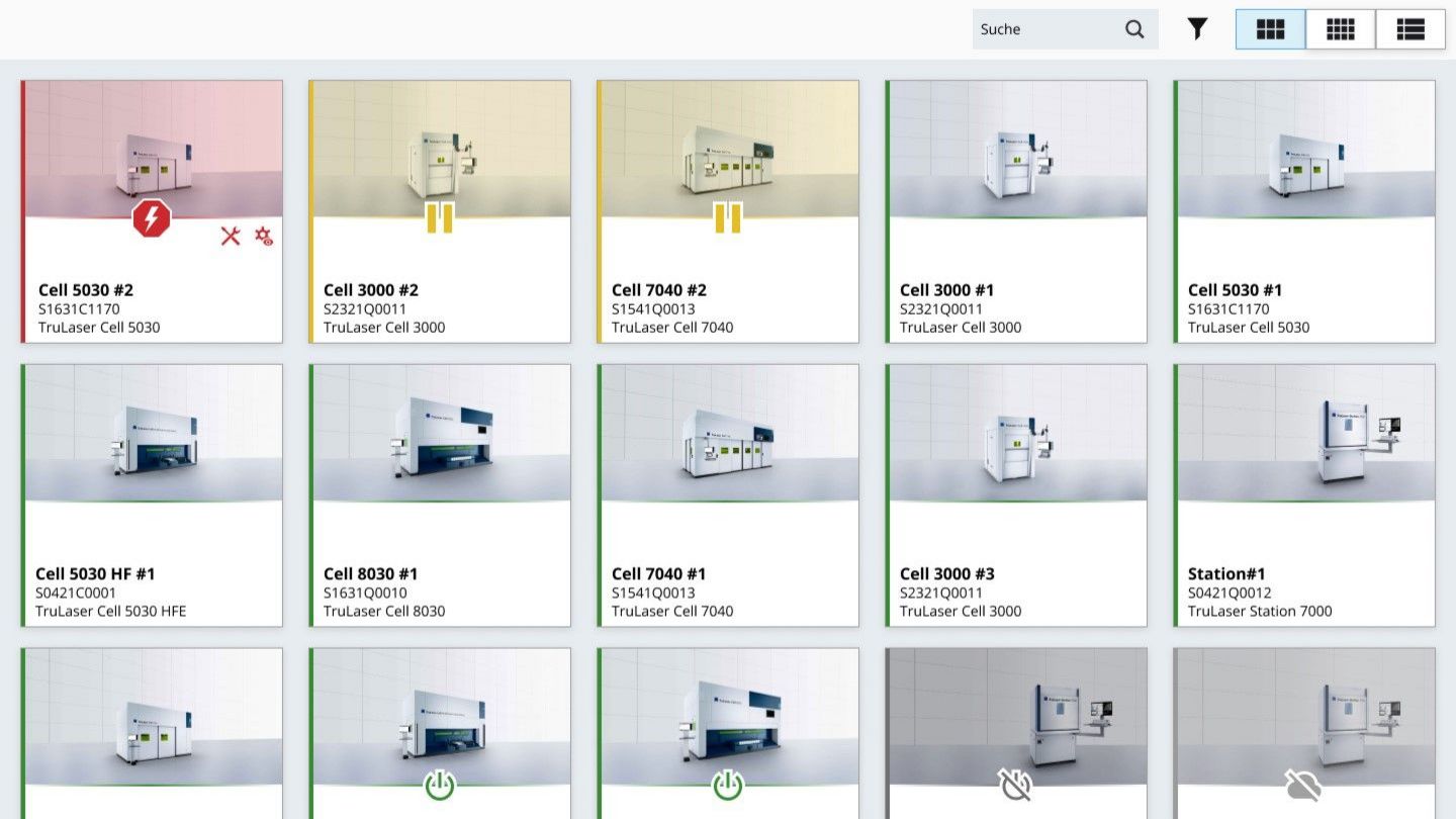 You have the option to access more in-depth detail views. In addition to providing insight into the status conditions, the dashboards also create transparency over extended device data, error messages that have arisen, device utilization, upcoming maintenance data, and changes made to the laser and laser programs.