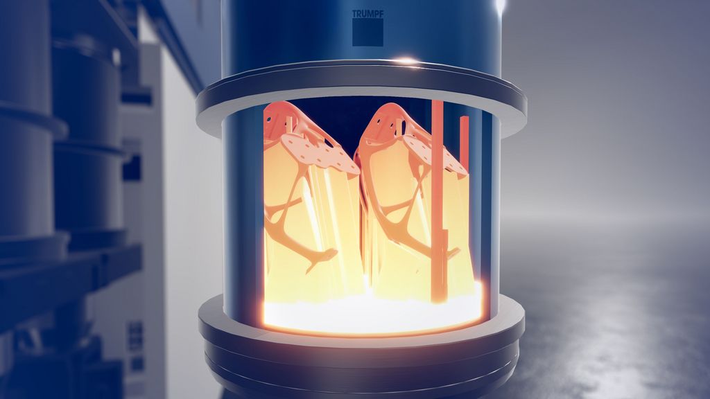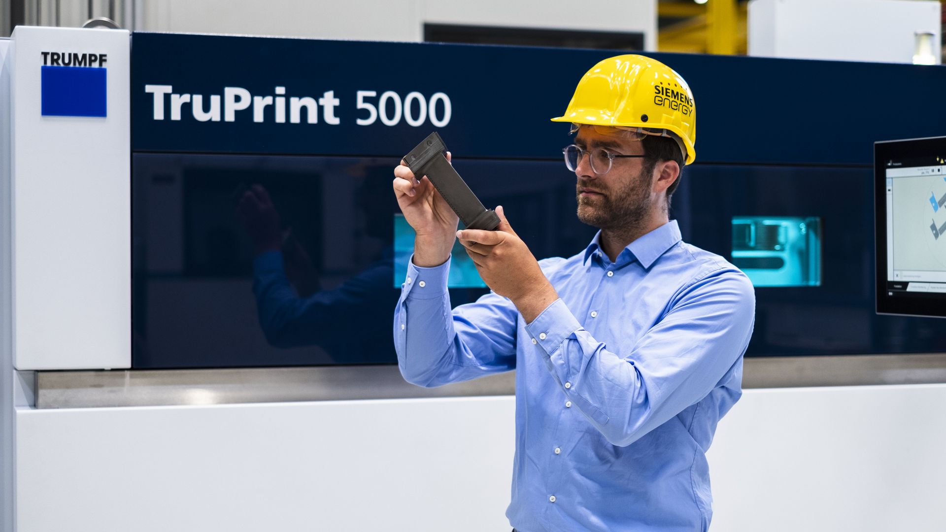 The TruPrint 5000 3D printer is a perfect fit for Siemens Energy's industry requirements. With the 500 °C preheating option, even the demanding high-temperature alloys used in the manufacture of gas turbines can be processed in a reproducible manner. The hot build cylinder with printed component is removed from the machine and placed in the inert cooling station; the machine simply continues working on the next job in the meantime. After cooling, the component is depowdered in the depowdering station; the remaining powder can then be sieved again under shielding gas. This decoupling of parts and material handling, based on the interchangeable cylinders, means that manufacturing is not only cost-effective and efficient, but also conserves resources at the same time. Siemens Energy and TRUMPF have shown how the TruPrint 5000 can be integrated in an industrial 3D printing process chain for high-temperature alloys – including digital data linking out of the office and back, performed by the machine.