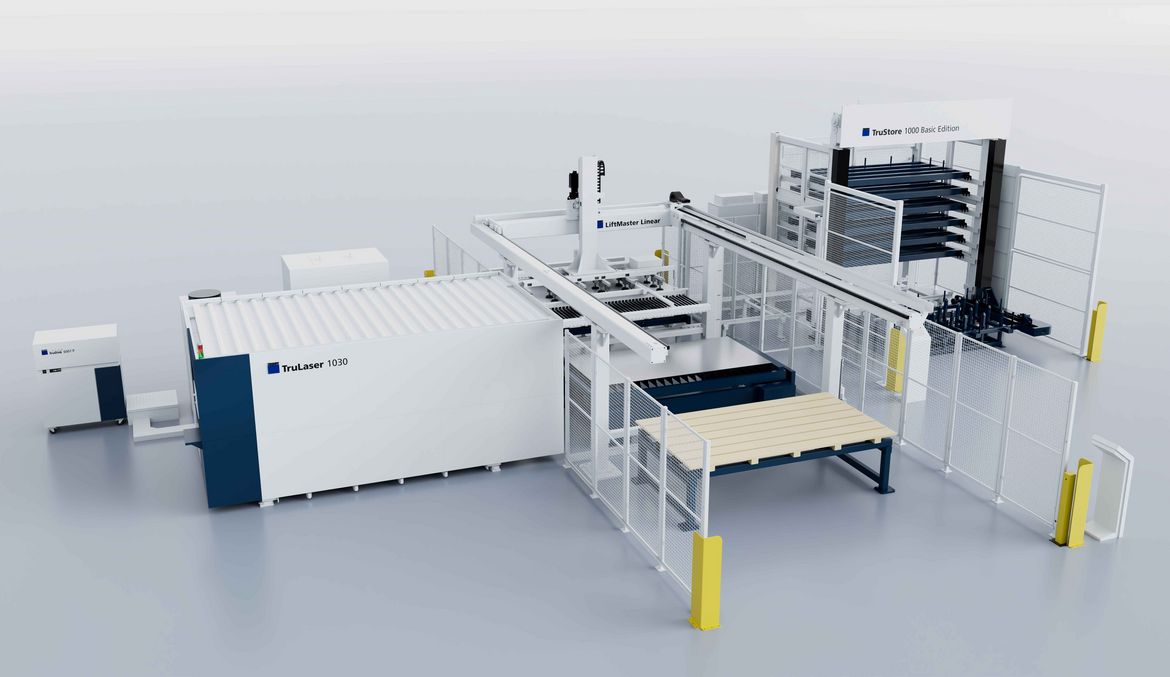 示例配置:TruLaser 1030 Fiber 搭配一台 LiftMaster Linear 1530 Basic Edition 与一台 TruStore 1030 Basic Edition。