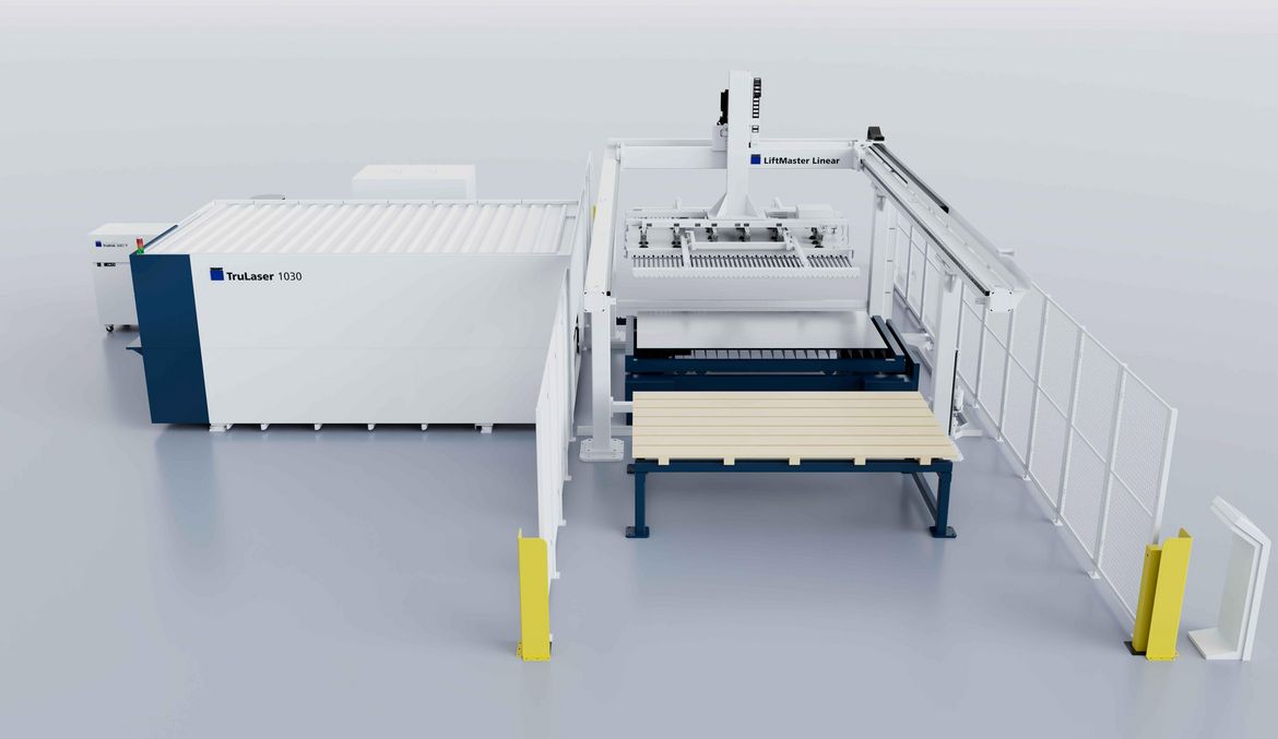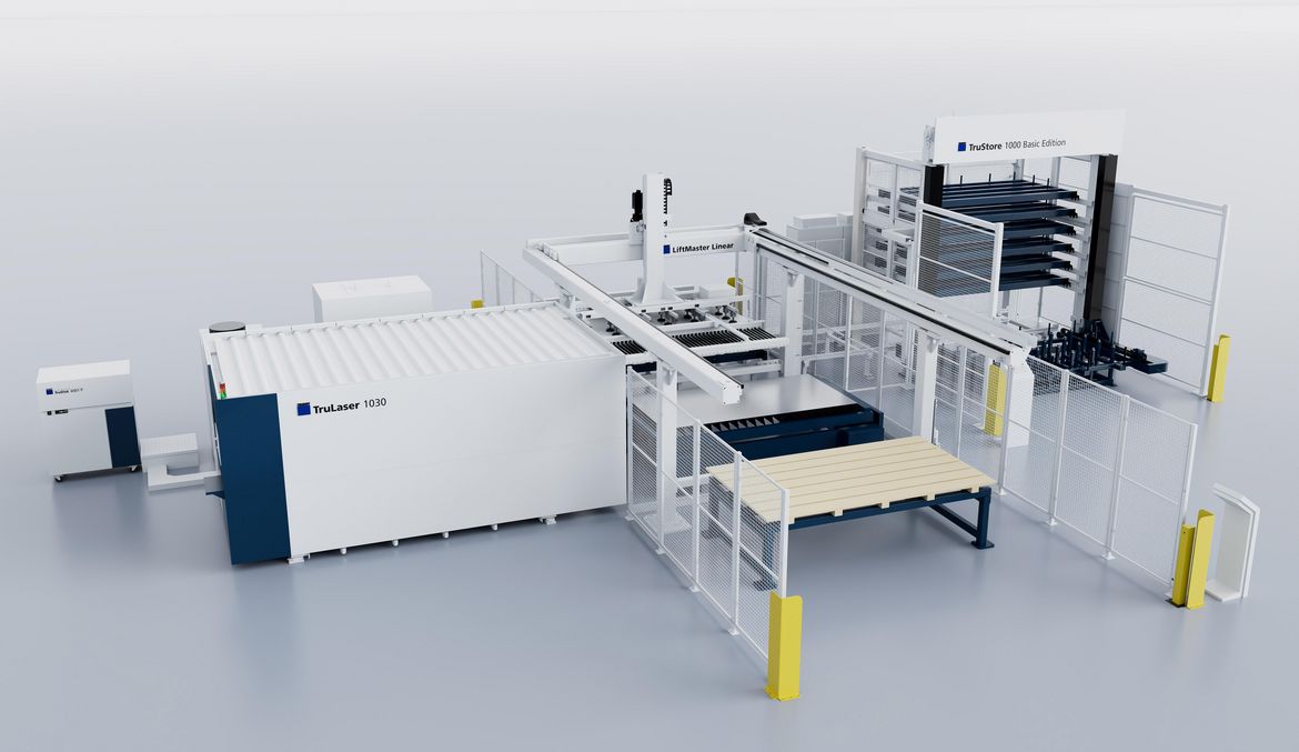 一台 TruLaser 1030 Fiber 搭配一台 LiftMaster Linear 1530 Basic Edition 和一台 TruStore 1030 Basic Edition。