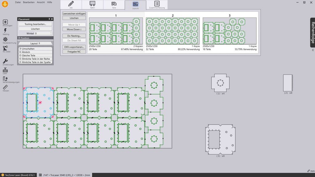 一键迸发效能:通过 Boost 按钮,您可以交互方式快捷管控订单并为其编程。TruTops Boost 通过自动化流程从多技术层面革新作业方式。该创新型软件可非常轻松地为您推荐解决方案。能够识别重复订单并以稳定出色的质量完成编程。借助新型排样处理器 Lean Nest 以及经过优化的排样算法,您可将材料物尽其用,从而节省成本。原因在于处理器将布局的排样参数纳入了考量,例如起始角、零件间距和板料边缘。Lean Nest 与之前的排样断面已默认启用。TruTops Boost 会自动输出极佳成果。