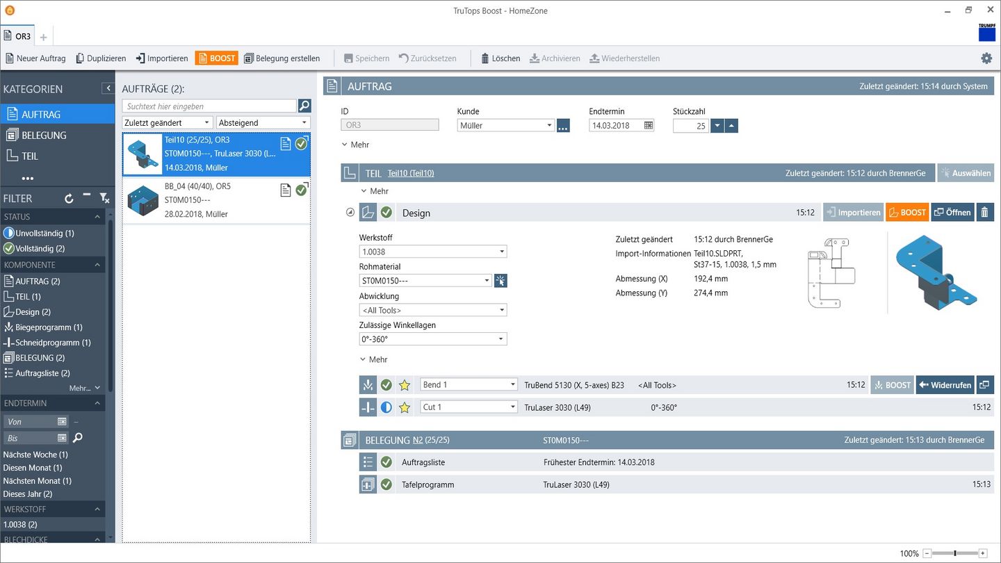 TruTops Boost 与 Quickjob 共用订单、零件和材料数据管理,便于用户轻松入门生产控制系统。