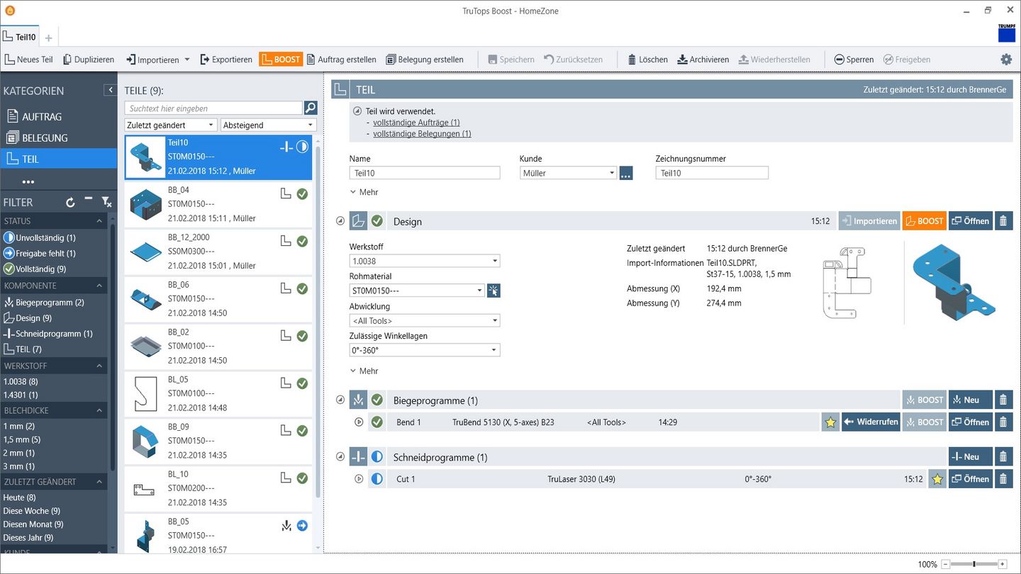 TruTops Boost 是一款用于对激光加工机床、冲床、激光冲床复合机以及折弯机进行编程与 2D/3D 设计的独特软件,而且还可一键提升效率。提升盈利能力!助力事业更上一层楼。