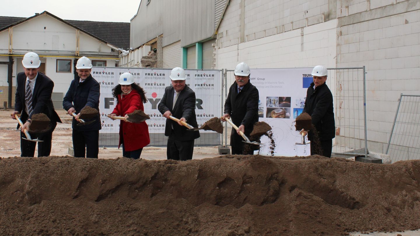 Teningen, March 27, 2017 – TRUMPF Werkzeugmaschinen Teningen GmbH is modernizing its headquarters. At the start of this year, demolition work began on old buildings that had already stood empty for years. Now, the groundbreaking ceremony for the new building has taken place: a new warehouse and a modern production hall will be built on a site measuring 3,700 square meters. In the future, the new buildings will house the main assembly line for the bending machines, plate shears and automation units manufactured at the site, and also provide space for offices, e.g. for production control. Additional storage areas for construction and spare parts are also planned.