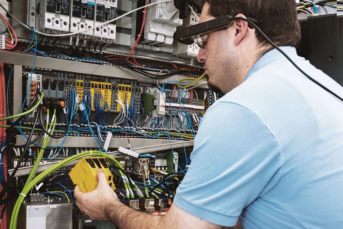 Christopher Poppel, a member of Francesco De Marco’s team, is carrying out repair and maintenance work on a machine using a virtual reality headset and two hand controllers.