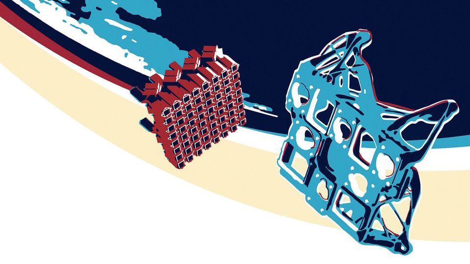 Another area where 3D printers come into their own is in the fabrication of satellite ­brackets to support the antennas and other components. Brackets are used in multiple places on a satellite, but these vital parts take up space and add to the overall weight. This is another area where 3D printing can help. Engineers can now minimize the amount of material in each bracket by printing them in shapes that are based on precise calculations of force distribution, just like with the antennas. Bracket weight can be reduced by up to 55 percent – a big saving for a component that is used numerous times in each satellite!