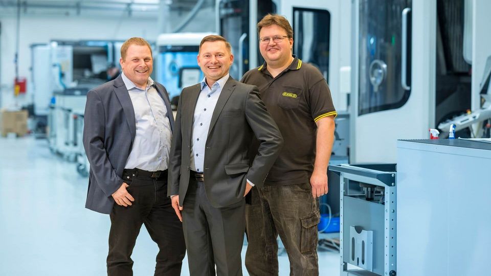 Horn 研发主管 Matthias Luik(左)与增材制造团队:Horn 增材制造主管 Konrad Bartkowiak 博士(中)和增材制造设计师兼新通快设备主要负责操作员 Michael Schäfer(右)。