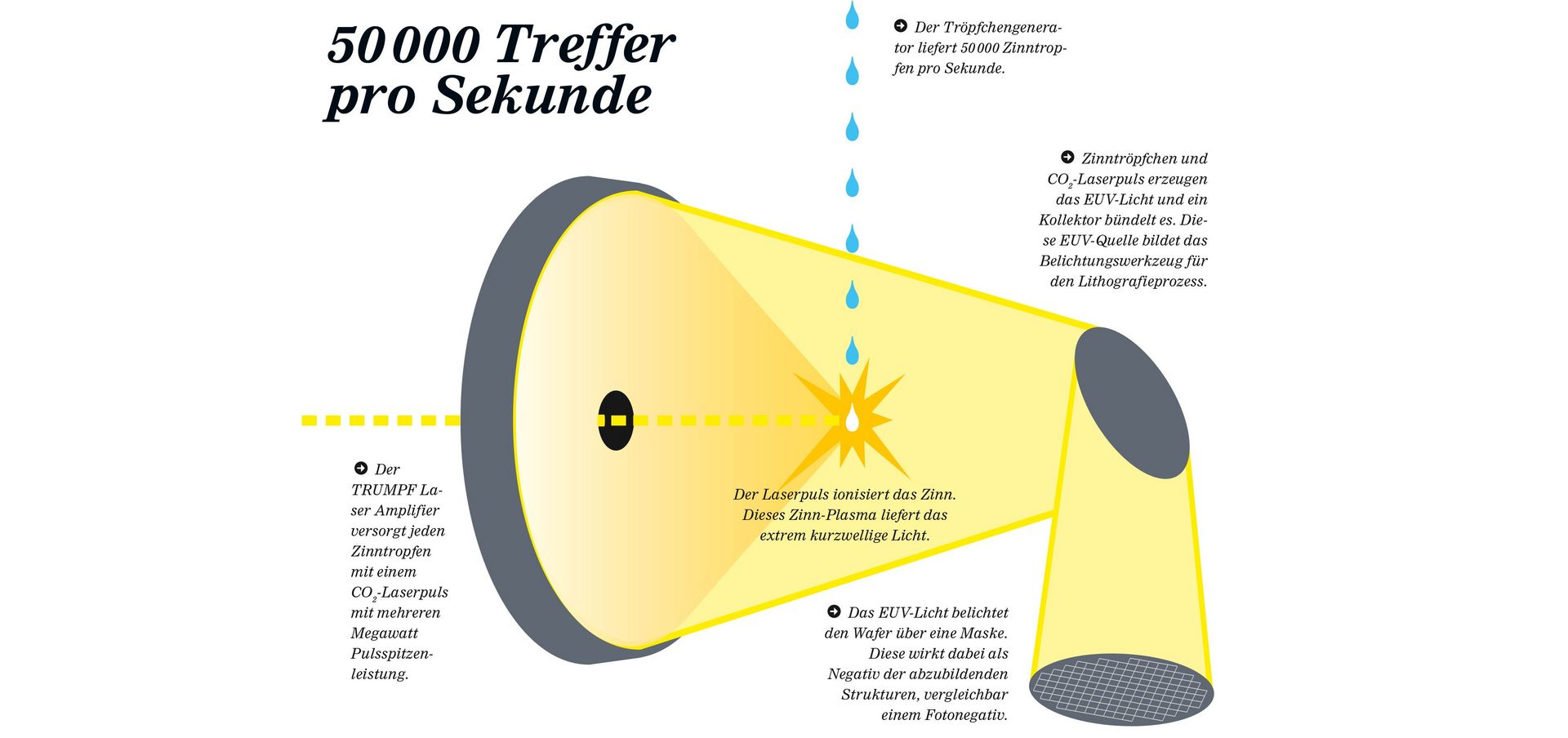 Plasma is generated either by focusing high-intensity laser radiation or with high energy discharges; tin and xenon are suitable for use as the input materials. Laserproduced plasma (LLP) has established a lead here. The idea behind this process sounds quite simple at first. A generator shoots tin droplets with 50-kiloherz into a vacuum chamber while a laser pulse impacts those droplets as they speed by.