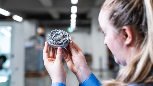TruPrint 1000 可实现快速经济的小批量生产。根据预制坯件可增材制造部件,无需支承结构。极其精细的格栅结构、细丝制成的槽道和众多集成功能只需一步即可实现。例如球体可通过内置活节在支架上旋转。
