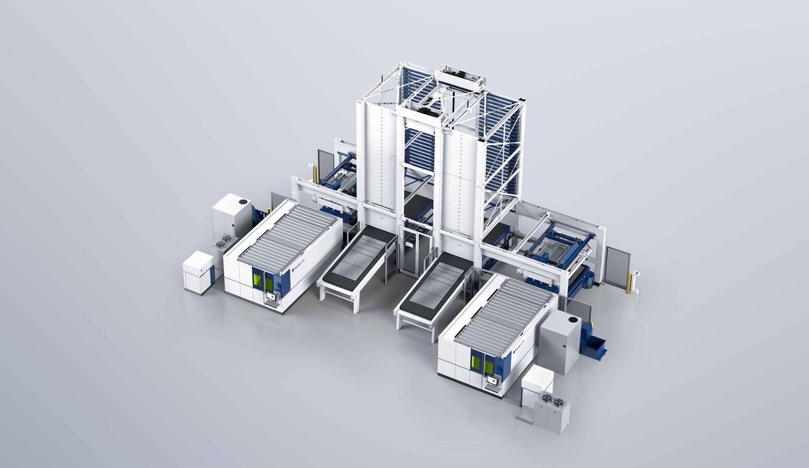 两台 TruLaser 3030 fiber 机床,配有两套 LiftMaster Compact、两套 PartMaster 以及一套 TruStore 3030