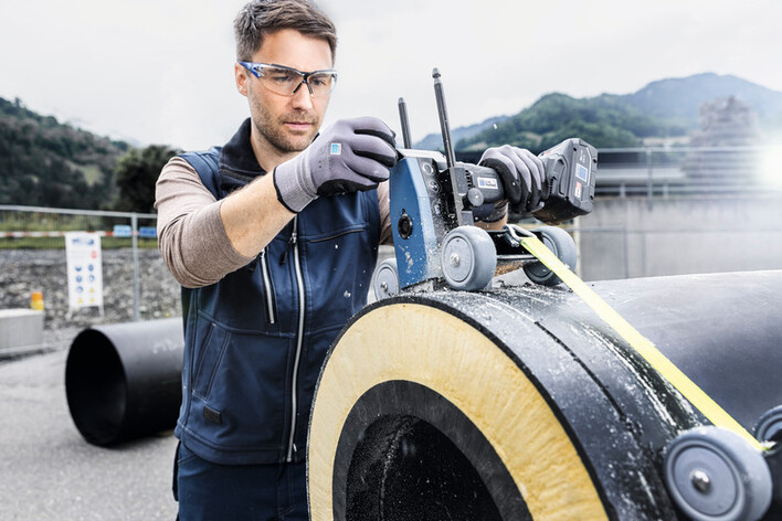 本机动力采用 18V 5.5 Ah LiHD 电池,性能强劲且作业速度可达 1.5m/min,而且从此再也没有电源线干扰您的工作。高级的切割方式可确保切割边缘干净整齐。由于没有毛刺形成,所以也免去了切割边缘的后续精加工。而且使用优质的切割工具也有助于提升切割质量。Tube Cutter 的结构形状被设计用于处理最大厚度 160 mm、管径 250 mm 至 1200 mm 的合成材料管。得益于自动关断功能,您无需使用额外的防护用品,也无需参加法定培训即可获准使用本机进行作业。您可在任何需进行切割的地方使用本机进行作业。
