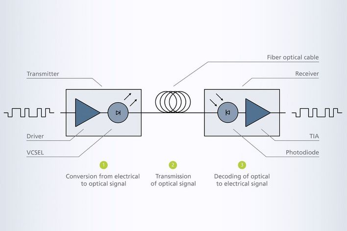 在现代光传输技术中,编码后的光信号通过 VCSEL 等光源发送,在另一端由光电探测器接收,并在此解码以传输信息。光线缆是建立光信号传输连接的最常用方式。
