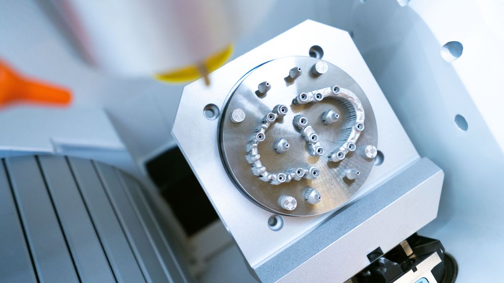 在牙科技术实现自动化批量生产的过程中,数字 连接至铣床 是一个重要的里程碑。为此, 专家扩展了增材制造系统的 IT 接口。 复合工作流实现 打印种植体支持的义齿 和套筒件以及随后 通过铣削技术精加工。得益于高精度 成果,种植体和义齿可以通过螺丝可靠地固定在一起。