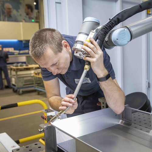 即使是在有焊工摇篮之称的港口城市汉堡,找到优秀的手工焊工也并非易事。Pfannenberg GmbH 的生产主管 Erik Westphal 解释道:“我们的部件主要由薄板制成。这需要精细动作技能和保持手稳,所以该领域的熟练工人很难找到。”此外,焊接大而重的外壳会对背部造成负担。从人体工学角度来看,从内部焊接也往往存在问题。因此,Westphal 四处寻找手工焊接工位的自动化方法。