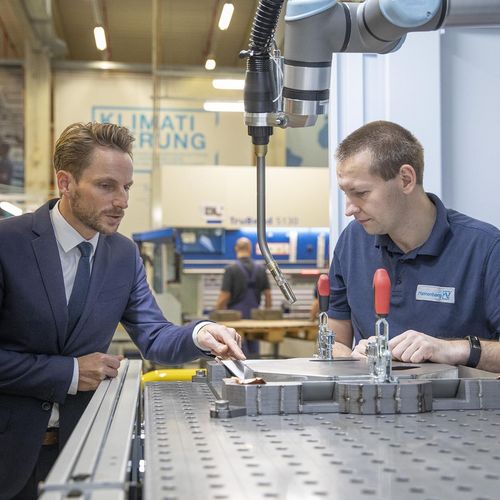 Erik Westphal 通过 TruArc Weld 1000 焊接单元找到了解决方案。该六轴协作机器人可以借助线性轴定位在部件的左侧或右侧,从而为加工提供更多的自由空间。Fronius 的高性能焊机具有 350 A 超细焊枪,即使是难以接近的部件部分也能可靠焊接。外部送丝系统和 Demmeler 的 3D 加工台(方便使用柔性夹具)使设备更加完善。安全技术符合通快机床的高标准。设备的亮点在于操作简单:设备操作员无需学习编程培训课程,只需将协作机器人手动摆放到位即可。通过机器人焊枪上的示教模块可直接确定路径点以及焊缝的开始和停止。