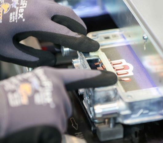 导体轨道纹理化:为使加热器极致纤薄,Webasto 不想加装任何导体,而是直接将导体施加到表面的金属薄层之中。“对于纹理化,我们需要整齐干净的烧灼和准确的边缘。材料不允许熔化,以规避产品缺陷风险”,Schmalenberg 说道。
